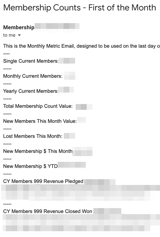If I wanted to show member count progress over time, I’d need to use Reporting Snapshots or something similar. (Reporting Snapshots are great, but they’re an extra step.) In this particular case, I wanted this data in an email is because it is destined for Google Data Studio, where it lives with website data that doesn’t belong in this Salesforce instance. While you can set things up to automatically go to Google Data Studio, sometimes it is nice to have someone take a look at the numbers before they go in, and to have a record in an inbox in case things go wrong.
