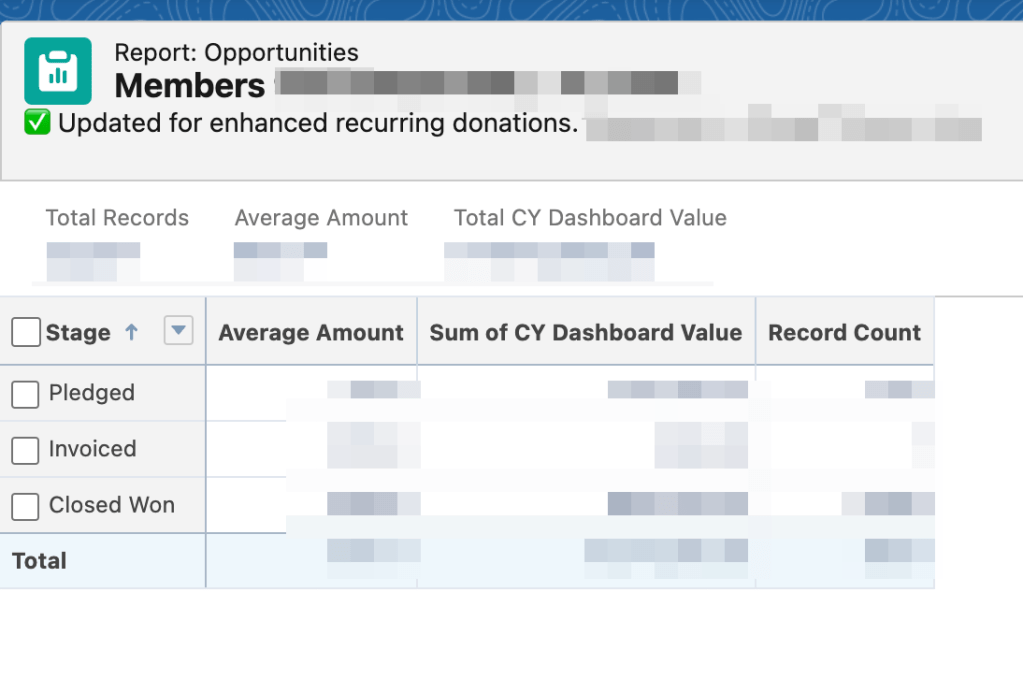 One really nice thing about the future pledges that LRD uses is that it makes it so easy to create reports for projected future recurring donations. While ERD does provide some useful functionality for this, I found that we needed an additional field as well as a lot of new reports to be able to do this. Because our users were accustomed to seeing Opportunity reports with pledged and closed won Opportunities, particularly for the current calendar year, I created a report that allowed them to continue to see similar reports, but with a new field called CY Dashboard Value. You can think of this as CY Pledged Value, but for this particular group of users, the term dashboard is useful. This let them continue to separate pledged vs. closed won revenue for the year in one report, and to get a total of both.