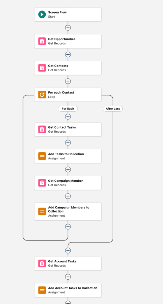 The first half of the Flow does have two DML elements in a loop, which is terrible, but for an organization where Accounts almost never have more than two Contacts, this won’t be an issue. In general, if these DMLs hit limits, that probably means the timeline would have been too verbose to be useful, anyway! Any of these Get Records elements could have filters that would ensure the results are manageable, both for the Flow limits and for the user who wants a quick overview.
