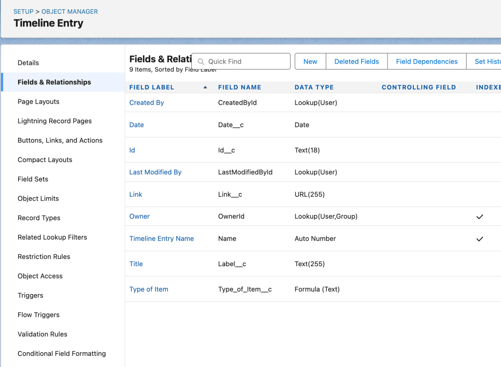 First I created a custom object called Timeline Entry. These records don’t actually get saved.